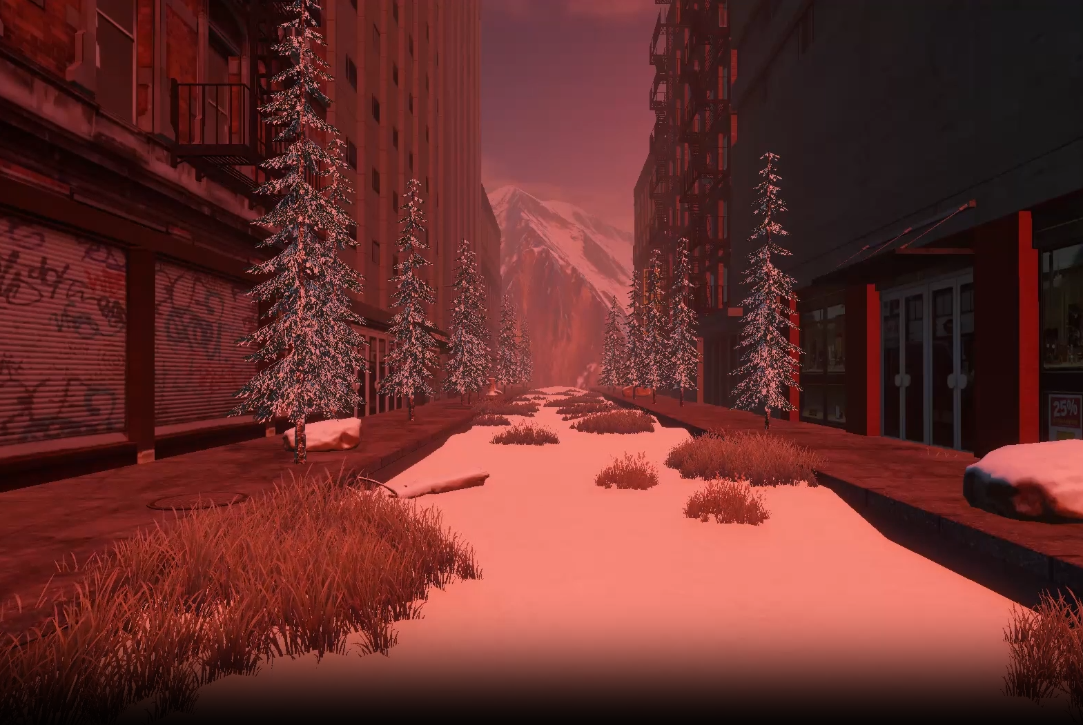 Common Ground is a series of 3D scenes built in Unity, exploring the intersection of human life where it may not seem apparent. I began this project with three seemingly incompatible environments: a warm field at sunset, a snow-covered mountain forest at night, and a red-lit urban street. Each scene uses different colours and elements, appearing disconnected from the others. Then, I gradually mixed and overlapped these different environments to serve as a portrayal of how we have more in common with strangers than we think. Snow settles into city streets, mountains rise behind storefronts, and desert grasses emerge along sidewalks. I want viewers to gain a sense of familiarity after seeing the visuals repeated, similar to the familiarity you gain when getting to know someone. I believe human connection is important, and I want to create work that is reflective of that by revealing common ground in human experience.