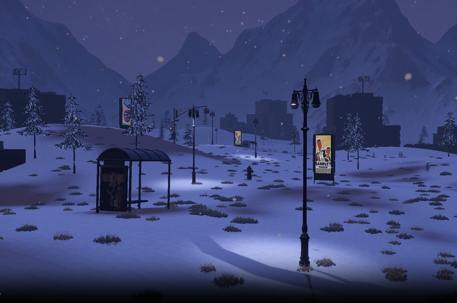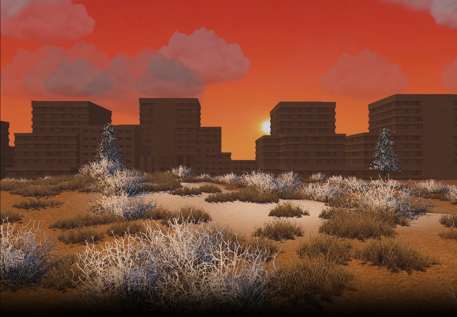 Common Ground is a series of 3D scenes built in Unity, exploring the intersection of human life where it may not seem apparent. I began this project with three seemingly incompatible environments: a warm field at sunset, a snow-covered mountain forest at night, and a red-lit urban street. Each scene uses different colours and elements, appearing disconnected from the others. Then, I gradually mixed and overlapped these different environments to serve as a portrayal of how we have more in common with strangers than we think. Snow settles into city streets, mountains rise behind storefronts, and desert grasses emerge along sidewalks. I want viewers to gain a sense of familiarity after seeing the visuals repeated, similar to the familiarity you gain when getting to know someone. I believe human connection is important, and I want to create work that is reflective of that by revealing common ground in human experience.